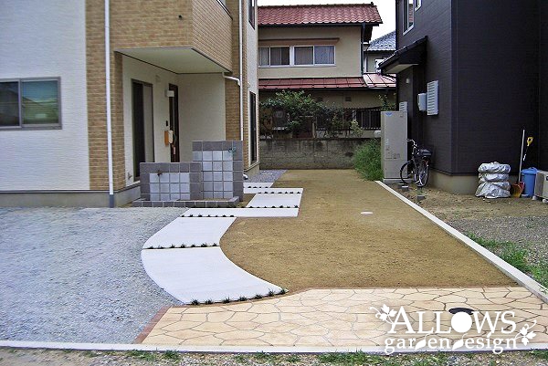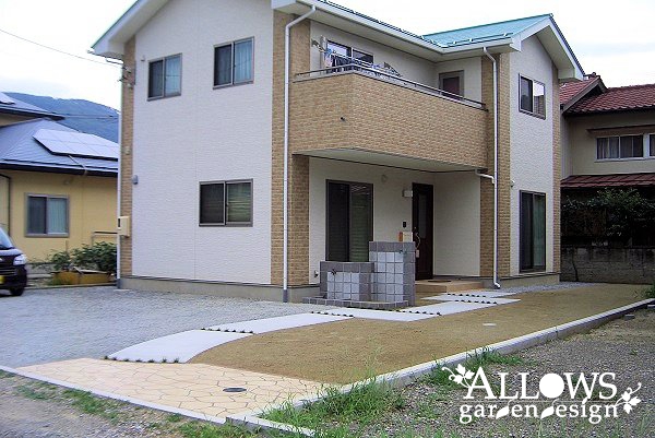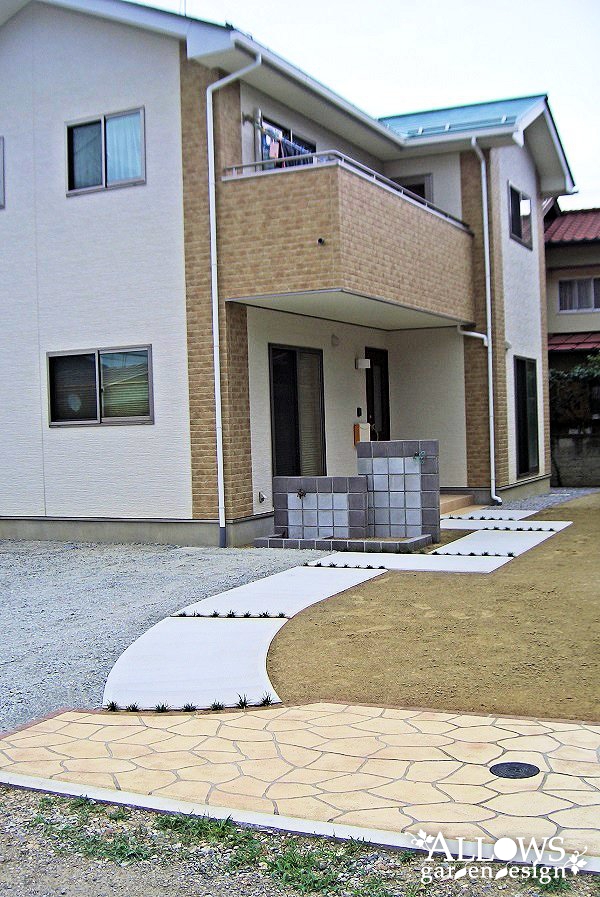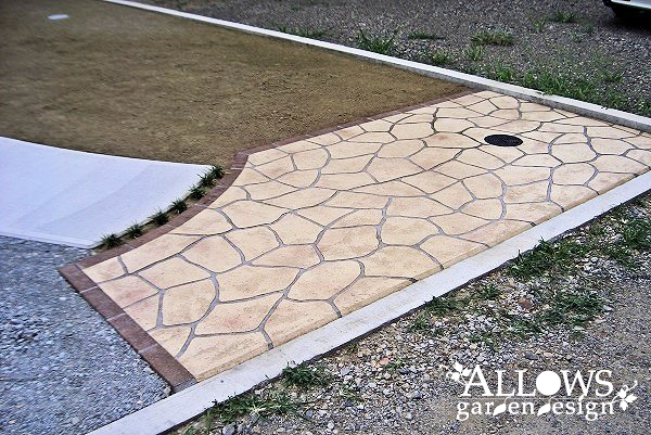アプローチはコンクリート舗装ですが、入り口部分だけ間口を広げて、ステンシルコンクリート+レンガ縁で