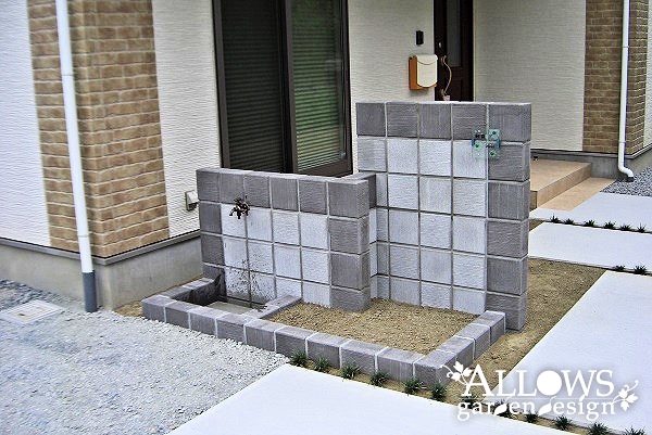 門柱は20cm角の化粧ブロックで、ツートンにデザインしました。