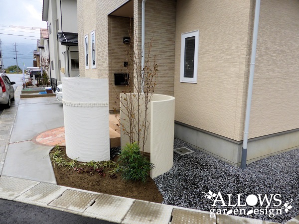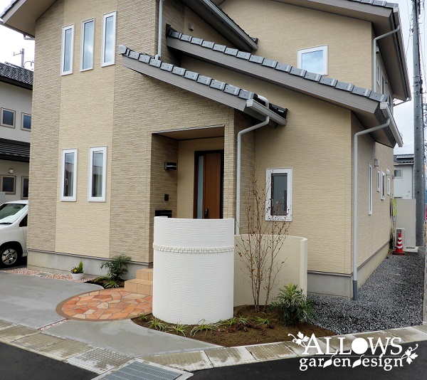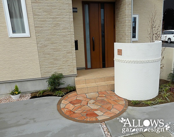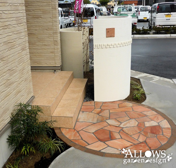 アプローチは天然石張り&レンガ縁をサークル形状に作って、半円形で高さを変えた2つの門柱と