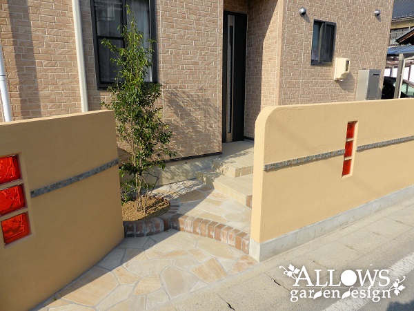 アプローチは天然の石張りとレンガのステップ。