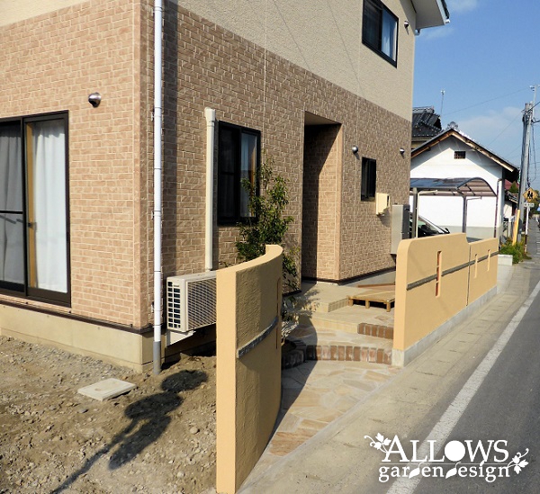 来訪者を優しく迎え入れる曲線形状の左側のウォールは、室外機を隠すのにも役立っています。