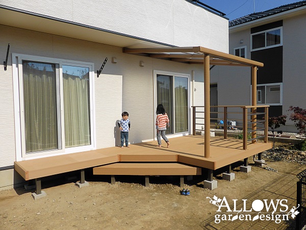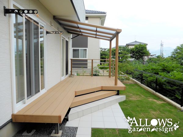 やさしい色合いのウッドデッキ+屋根です。