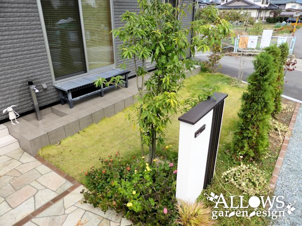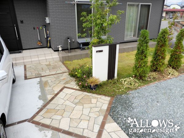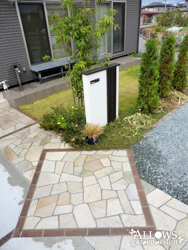 アプローチはシルバーの天然石張りで所々にダークブラウンのレンガでアクセント。