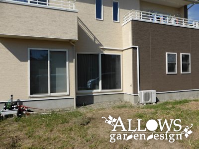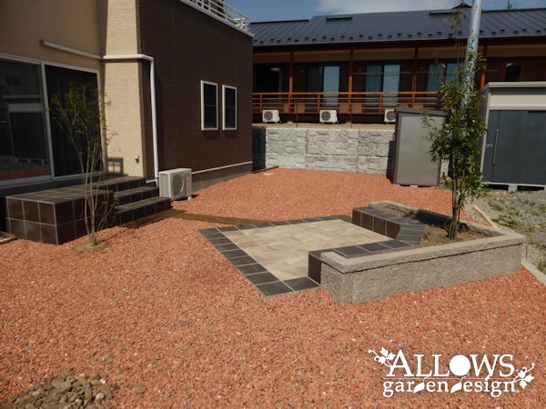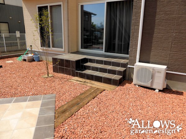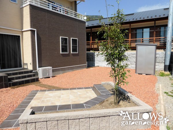 住宅の掃き出し窓の前と庭の中央にタイルテラス、その他の部分は防草シートの上に