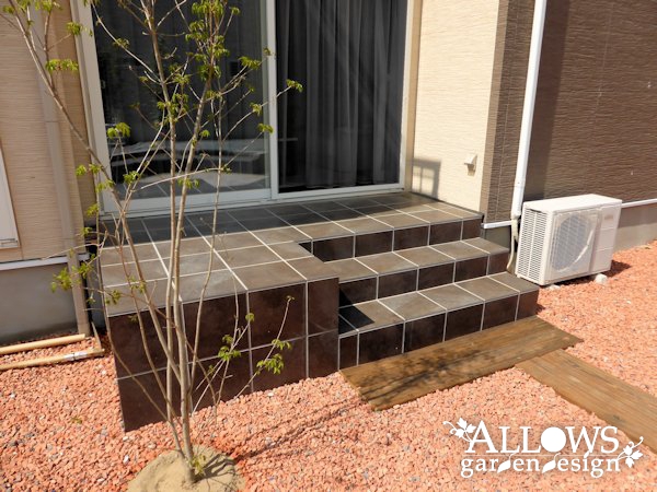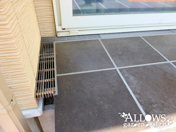 家から庭に出るためのタイルテラスは、室内のFL(床の高さ)とほぼフラットに。