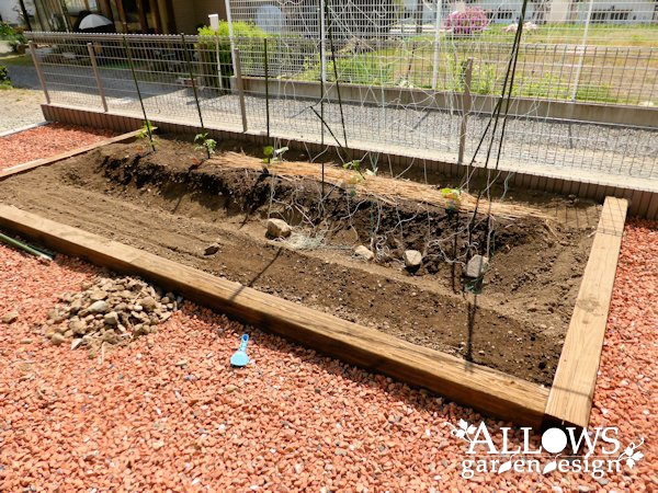 中央のテラススペースは、背面にベンチを立ち上げてその後ろは花壇にしました。