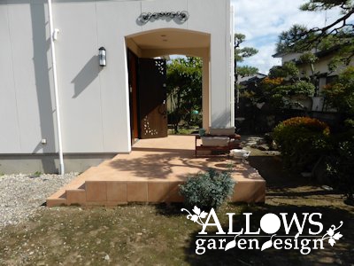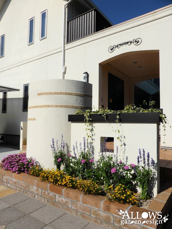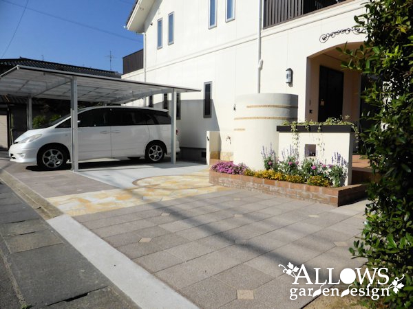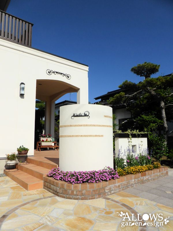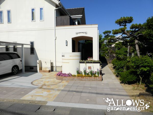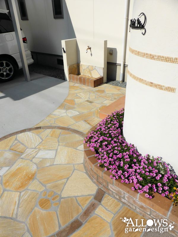 アプローチの石張りもレンガで囲ってサークル状にして、うまくコーディネート出来ました。