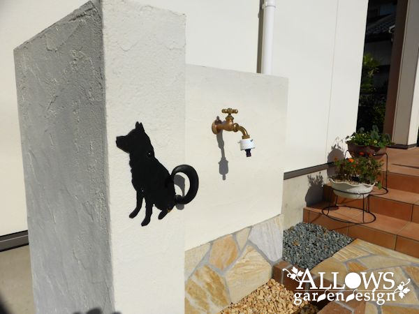 アプローチを進んでいくと、左側にはガーデニング水栓。