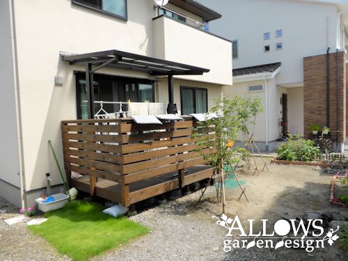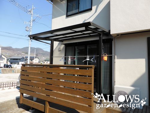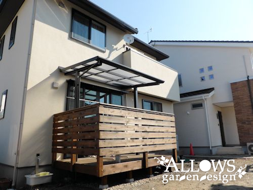 南側のガーデンには、ウッドデッキとテラス屋根。