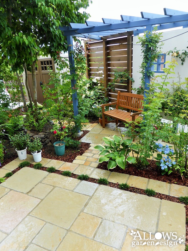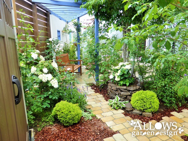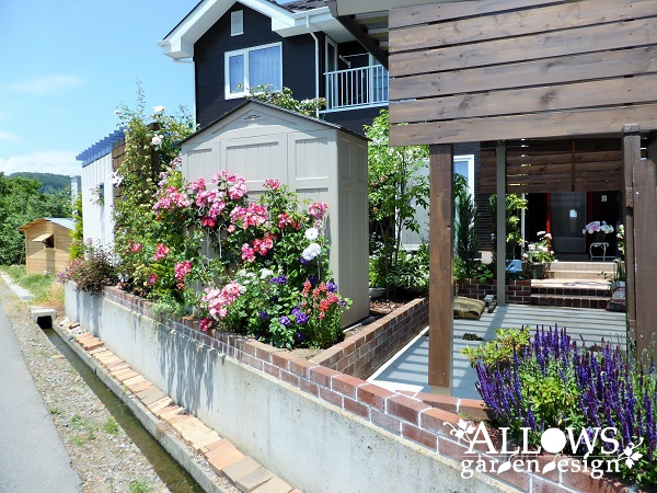 そしてガーデングッズを収納するお洒落な物置やバークチップは お施主様がDIYで施工されて、一緒になって庭づくりをさせていただきました!
