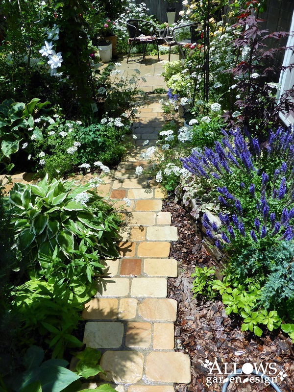 庭の小道やテラススペースは天然石の石畳に。