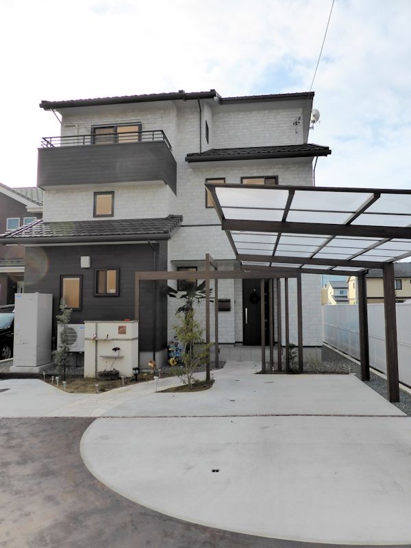 カーポートはタカショー製のアートポート。車の後ろに自転車を置くため、延長タイプになっています。