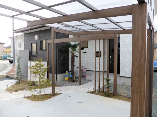 ということで、こちらの作品はカーポートに木目調のタイプを採用。柱や梁、屋根の枠まですべて木目調のとてもお洒落なカーポート。