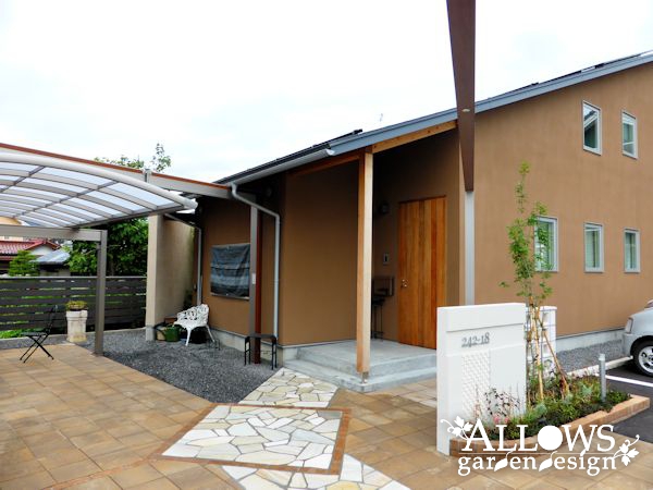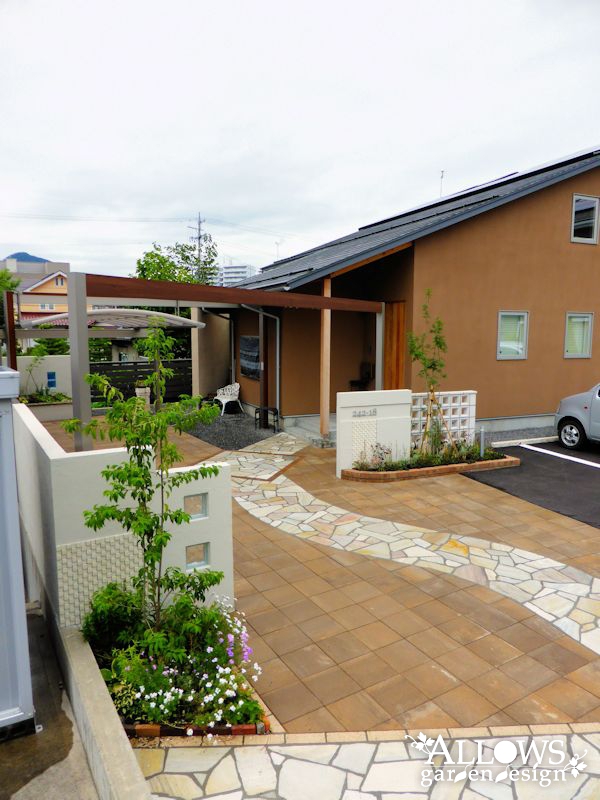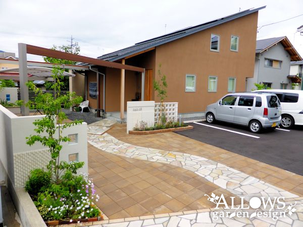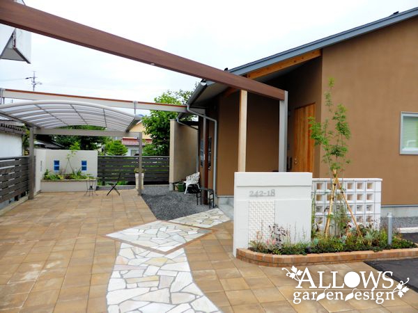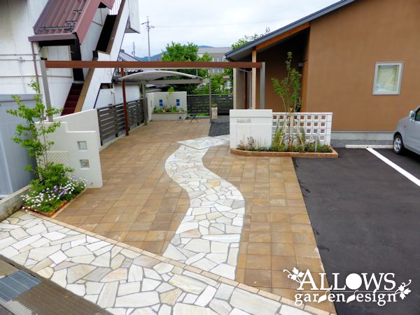 ローメンテナンスを求めて広範囲に舗装しましたが、ナチュラルな色合いのインターロッキングを採用したのでお洒落でやわらかい雰囲気になっています!