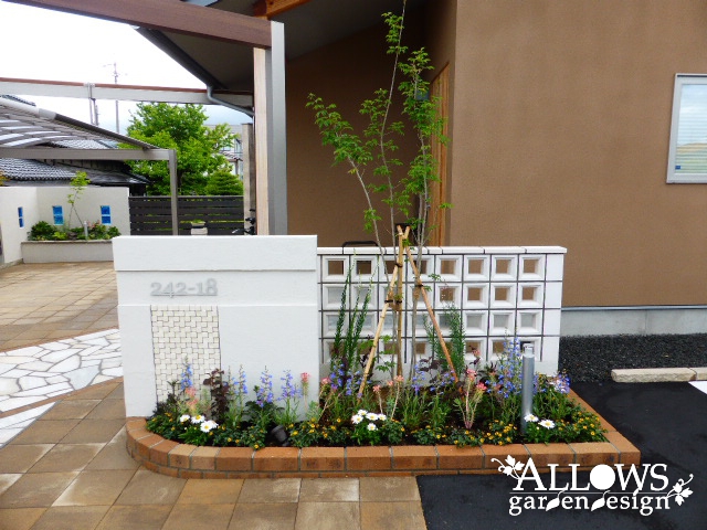 数カ所に点在させたフォーカルポイントのウォールには、全て花壇も作らせていただき、癒しのグリーンも感じられます。