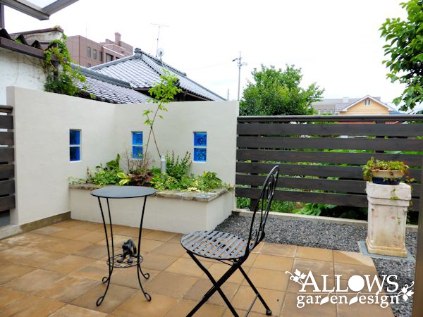 高めのウォールでしっかりと目隠しして、両サイドはレッドシダー製の横張りフェンスでナチュラルに。