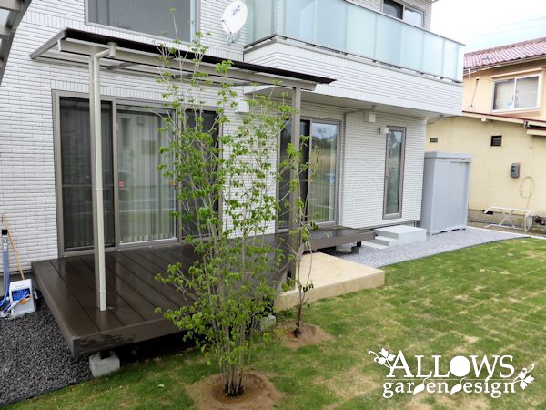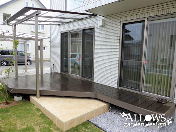 ガーデンには、人工木のウッドデッキとテラス屋根。