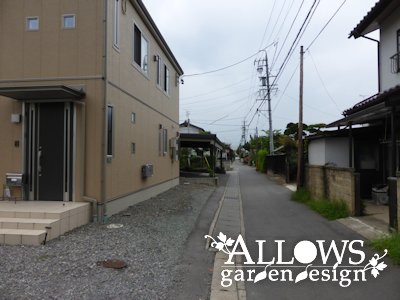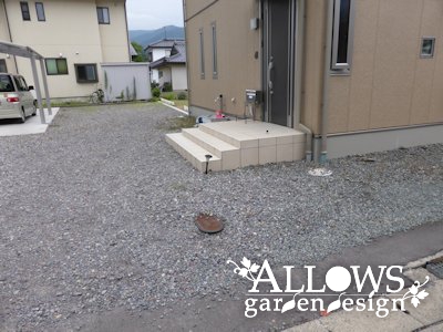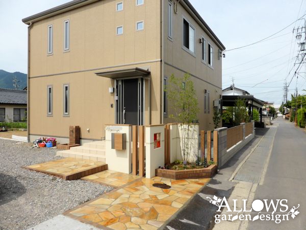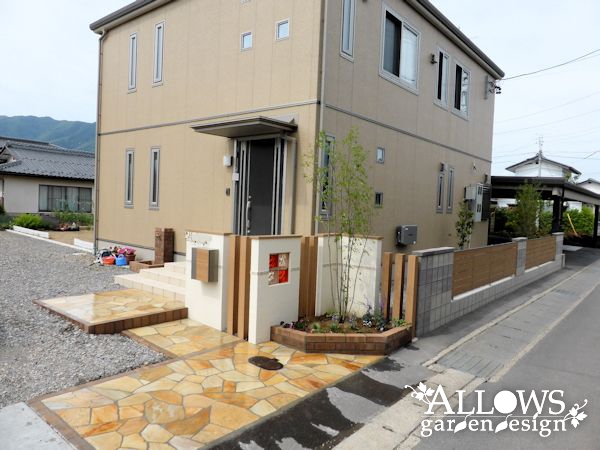 玄関前のスペースに、アプローチと門柱、さらにその門柱と続けて道路沿いに塀を設置しました。