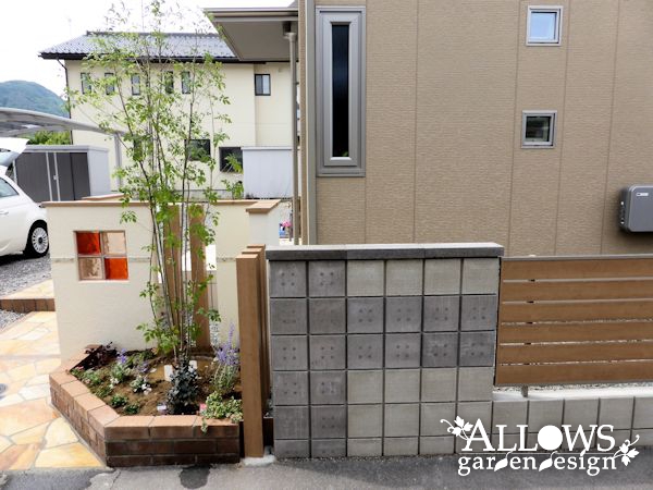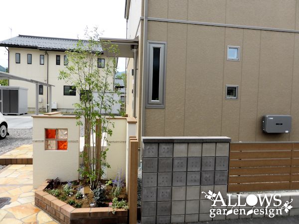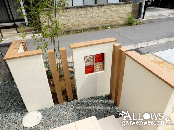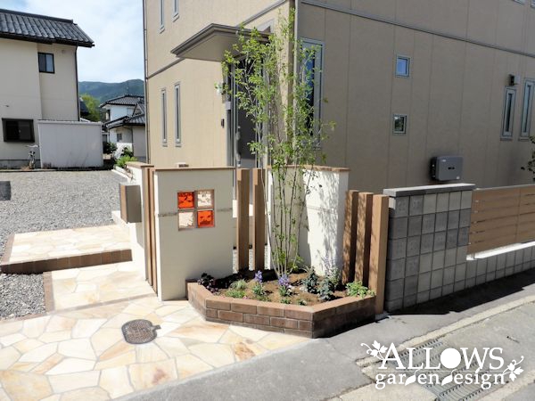素材としては、アルミ、塗り、レンガ、石張り、ガラス、タイル、ブロック・・・と、たくさん使用しましたが、色の系統を合わせたので、ごちゃごちゃとした印象にはなりません。