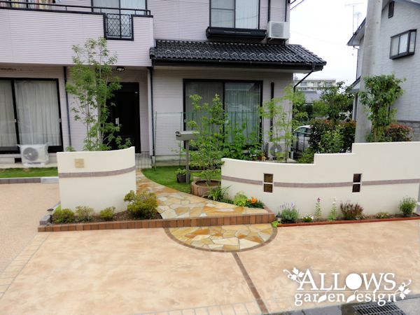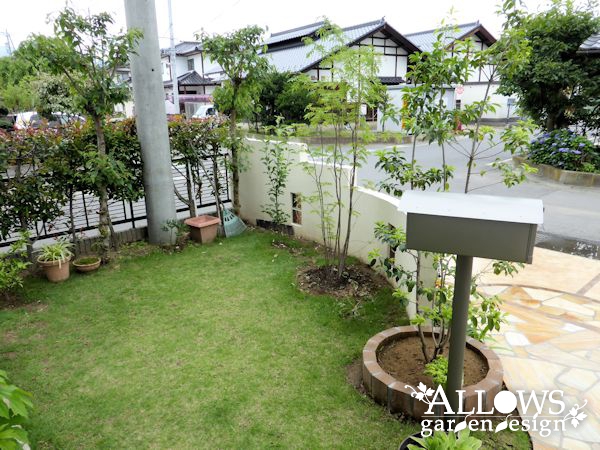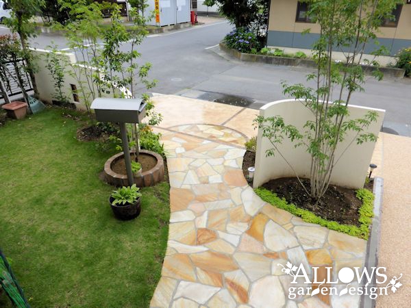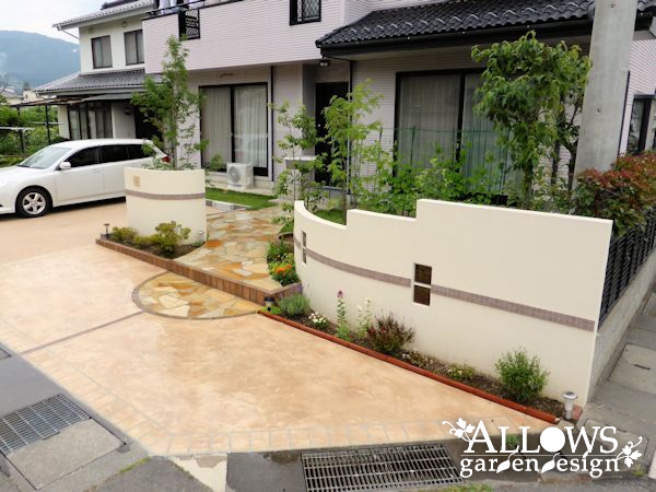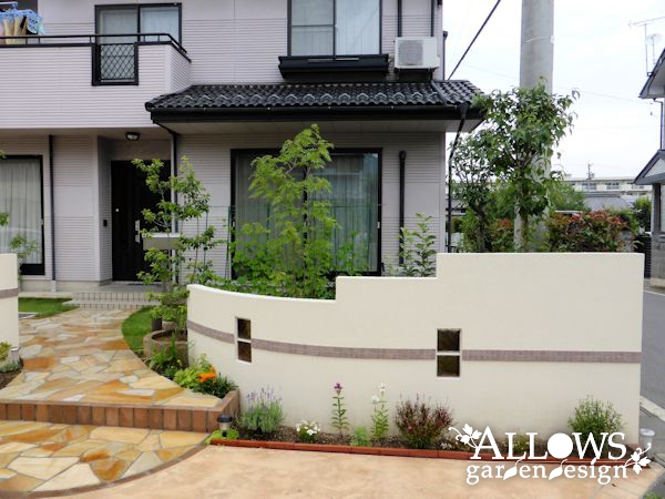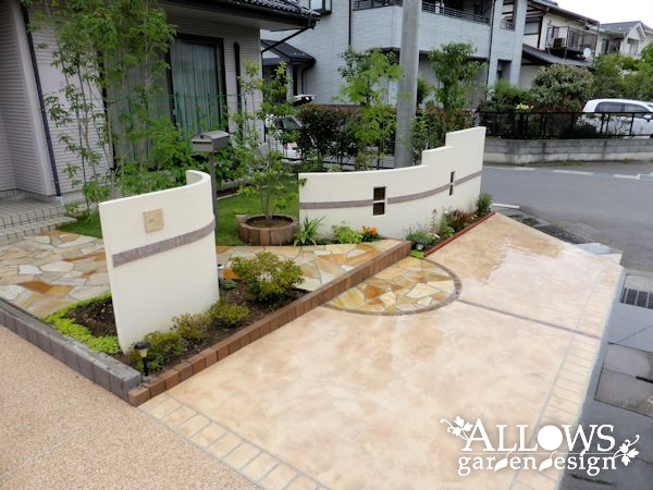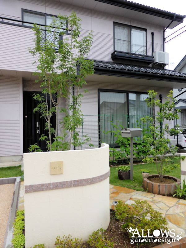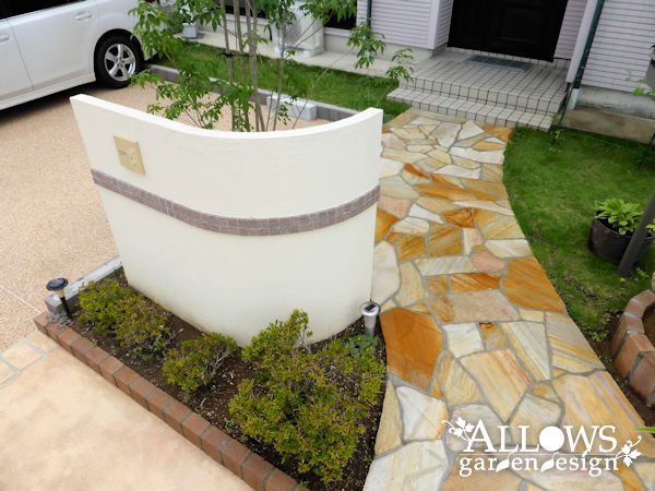 右側のウォールは、アプローチに近付くにつれて高さを下げていき、植木を主役にしています。