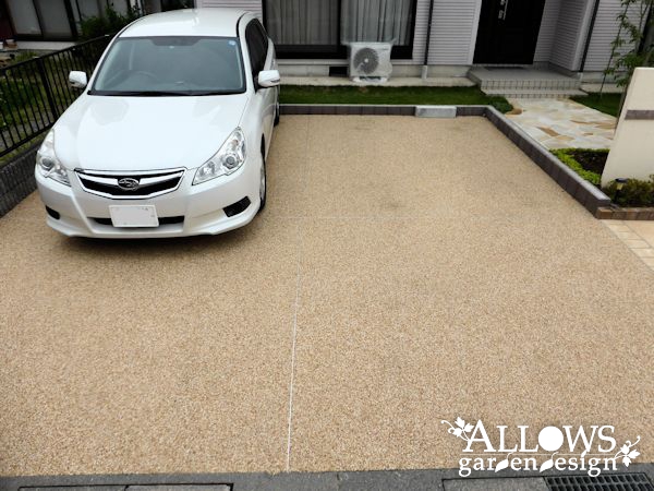 数十年経った駐車場のコンクリートは、樹脂舗装でリフォーム。