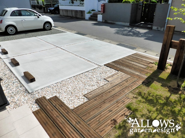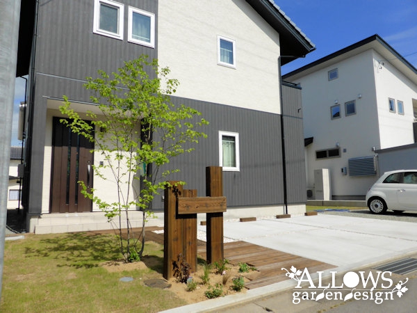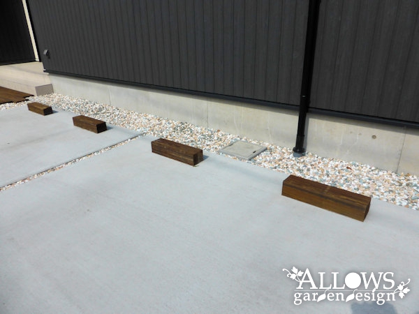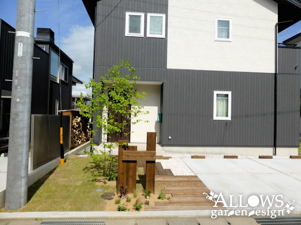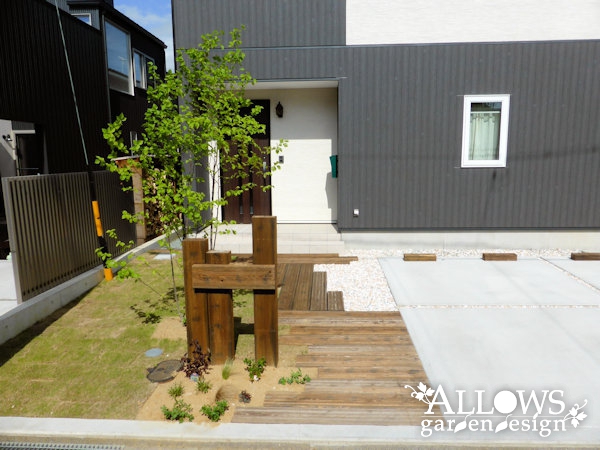 ファサードを枕木でまとめた、ナチュラルテイストなエクステリアです。