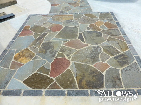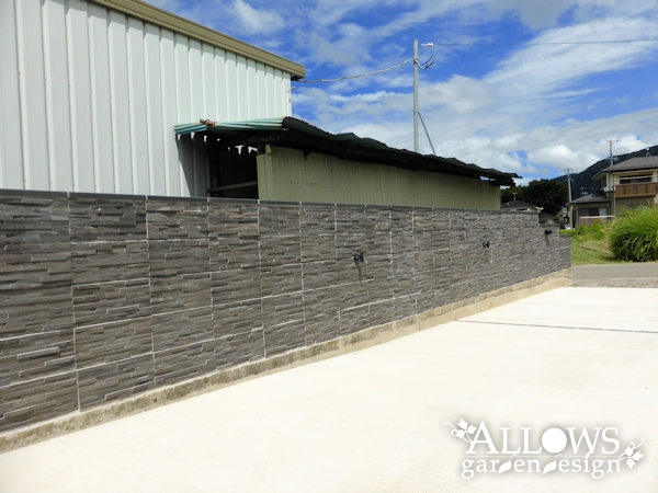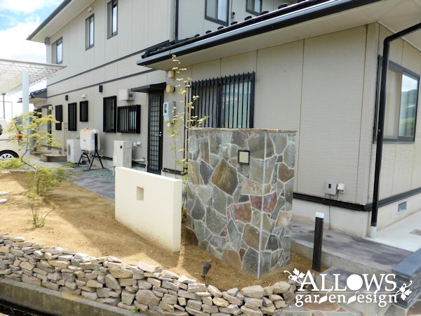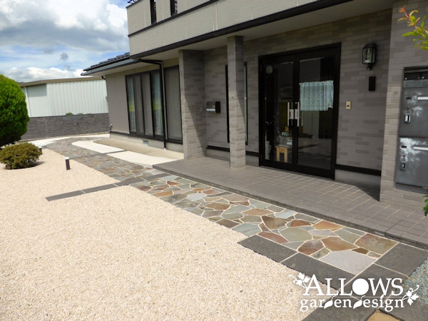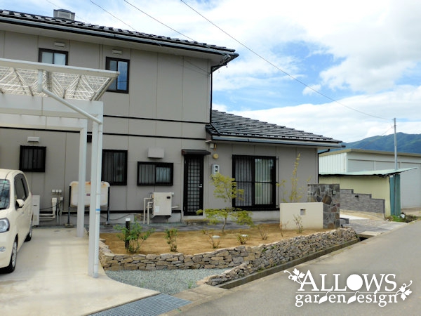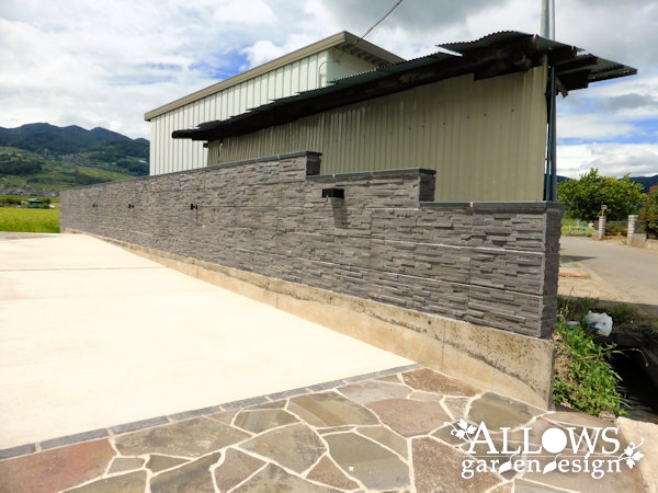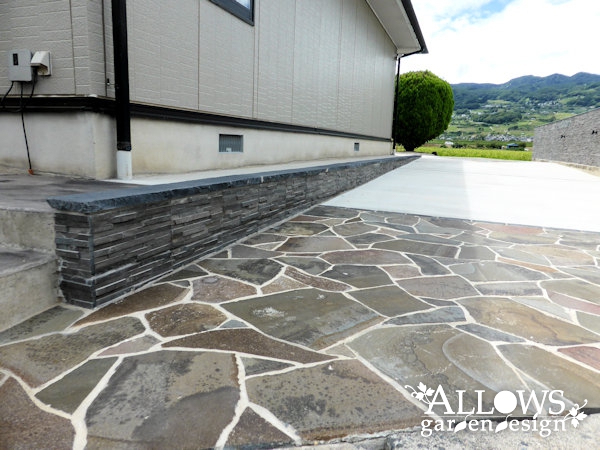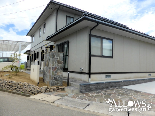 メインは土間コンクリートですが、道路面には鉄平石を張って門まわりとの統一感を出しました。