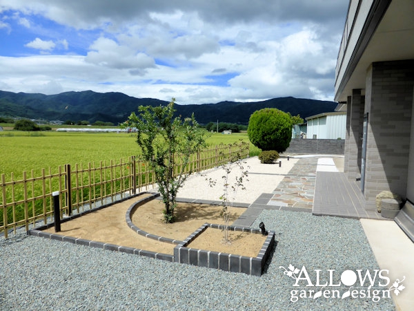 全体的にサビ砂利を敷き詰め、一段低い田んぼとの間には竹垣を設置して安心感のある空間に。