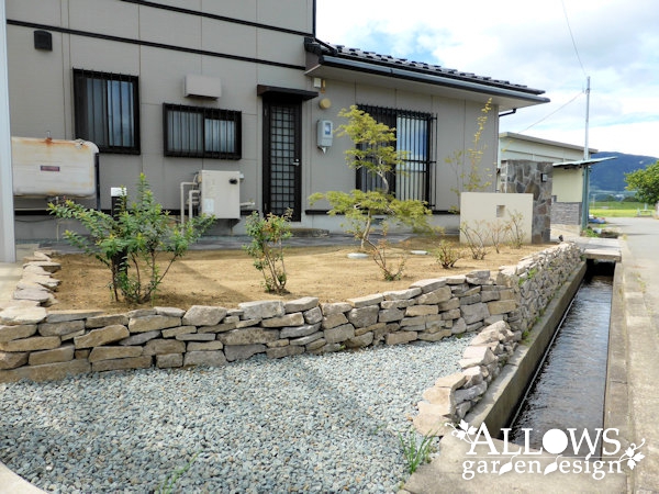 上の段をフラットにして、段差部分は戸隠石積みの土留めを施工。