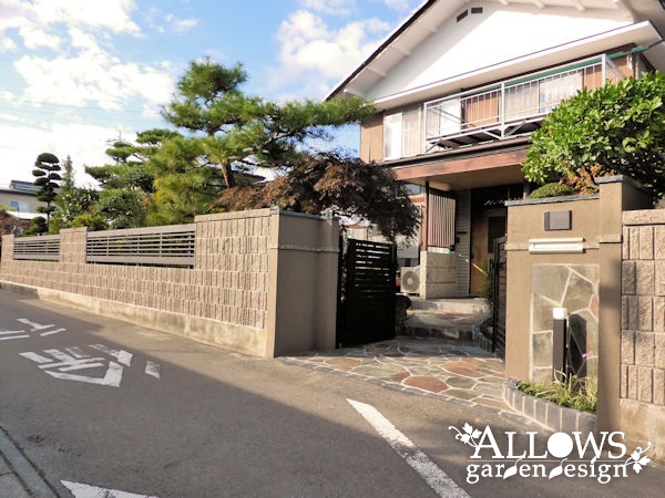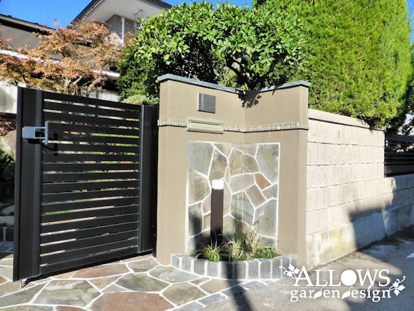 大谷石の門柱を撤去して、落ち着いた色調の塗り壁に。