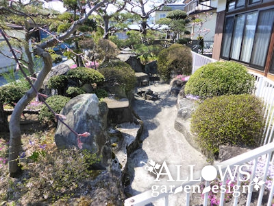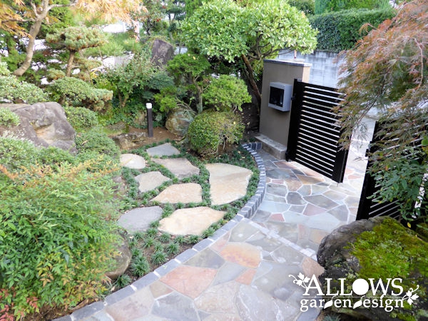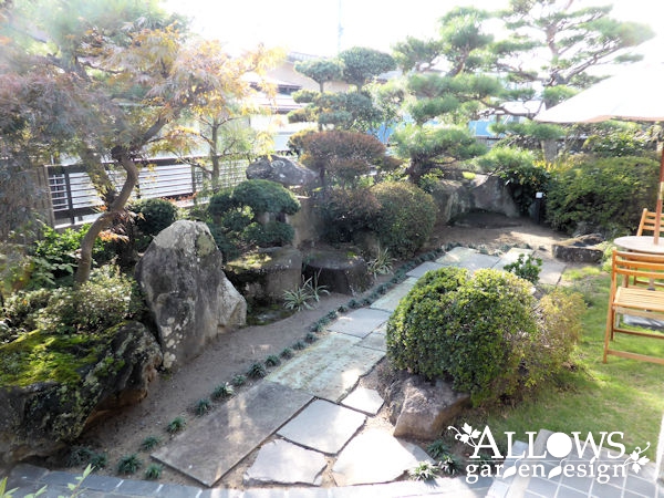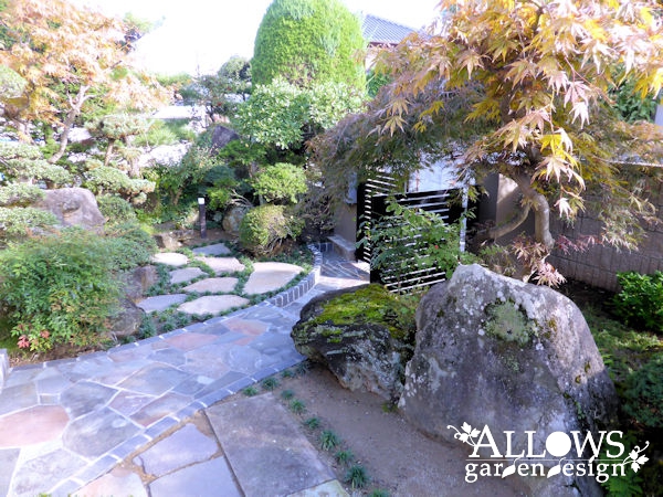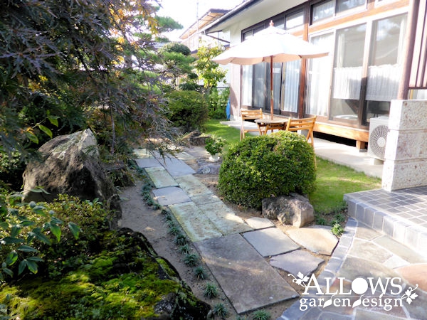 アプローチは自然石の飛び石で形成され、雰囲気は良いのですが歩きにくさが難点でした。