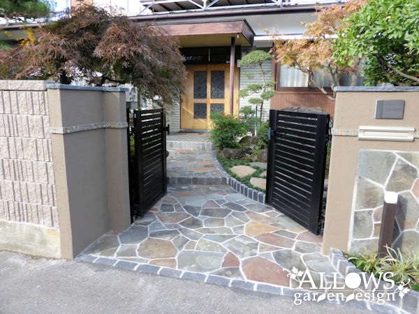 アプローチには佐久鉄平石を張り、ゆとりある階段も新設。