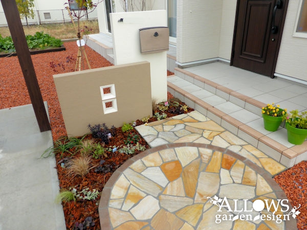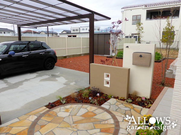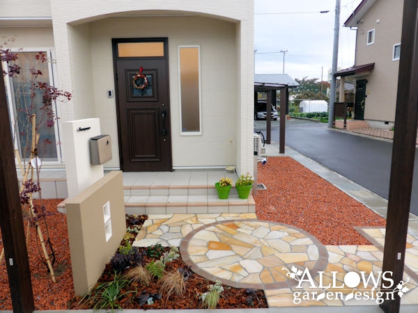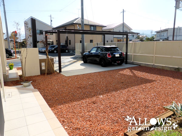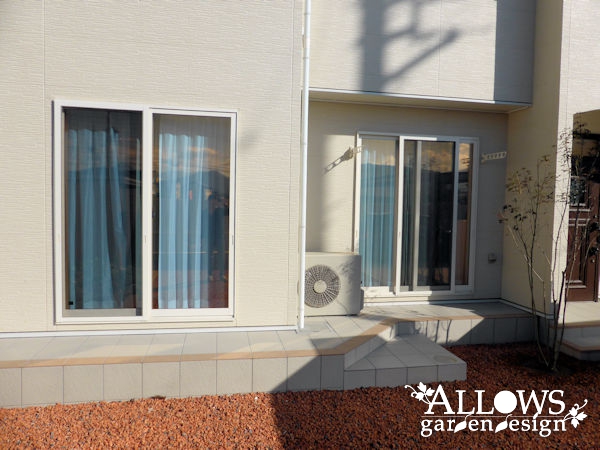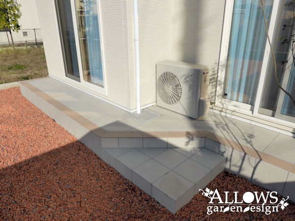 タイルテラスは玄関ポーチと同色に仕上げ、ガーデン部分は防草シートの上に化粧砂利を敷き込みました。