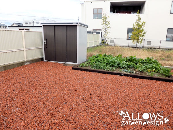 ガーデンの部分には、ローメンテナンスの防草シート+化粧砂利仕上げ。