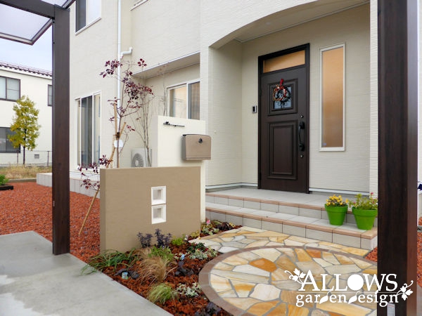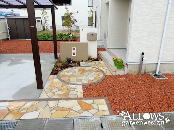 門柱はツートンカラーに塗り分け、アプローチは天然石の乱張り。