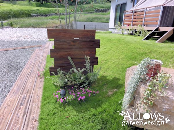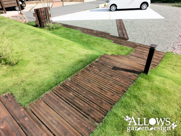 その横には、夜でも危なくないように木目調のポールライトを設置しました。