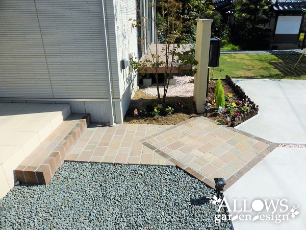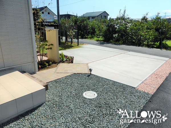 駐車スペースはコンクリート仕上げ、アプローチは方形の天然石です。
