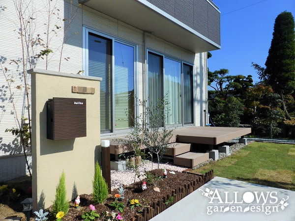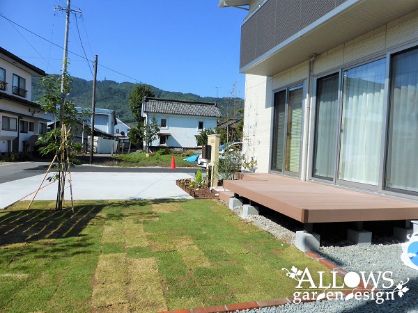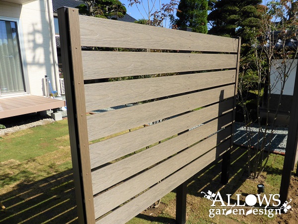 ガーデンはウッドデッキと芝生の庭で形成し、道路との仕切りに目隠しの樹脂フェンスを設置しました。