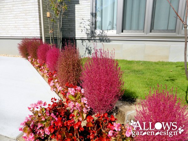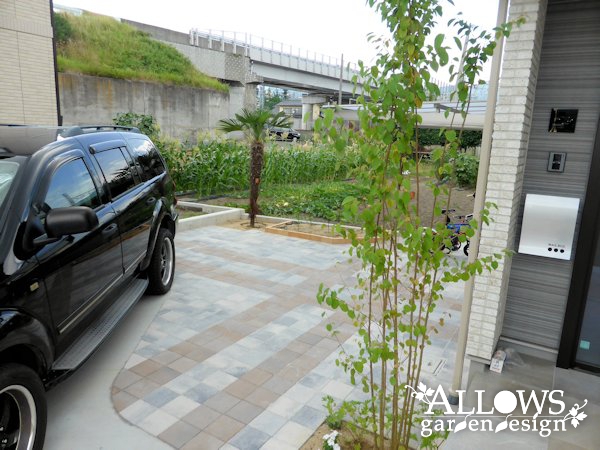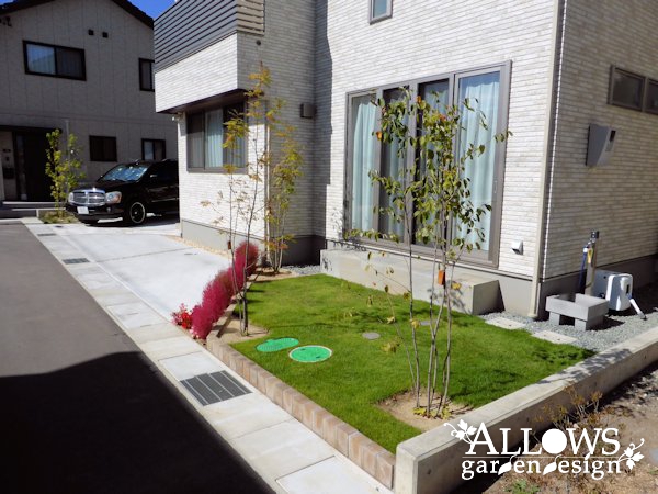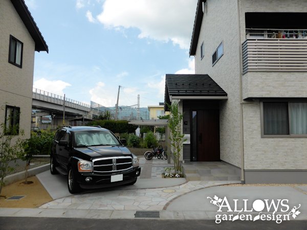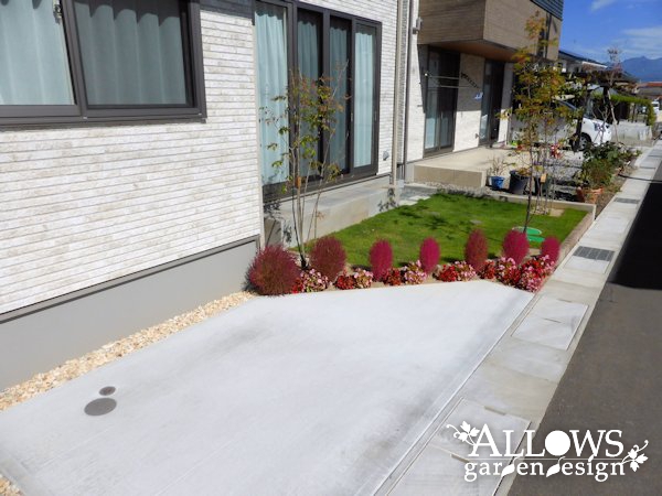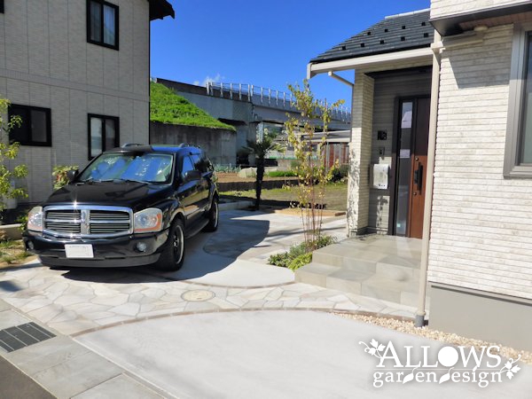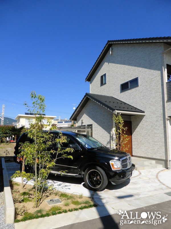 今回のポイントは、車の止め方の工夫と二つのスペースに分けたガーデン。
