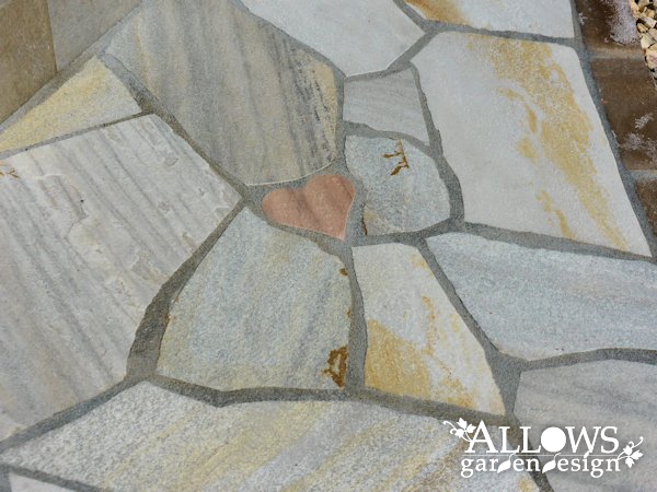 アプローチ、ホワイトの天然石乱張りにアクセント。