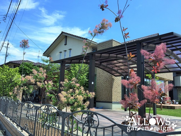 駐車スペースと道路との間には、スモークツリー。