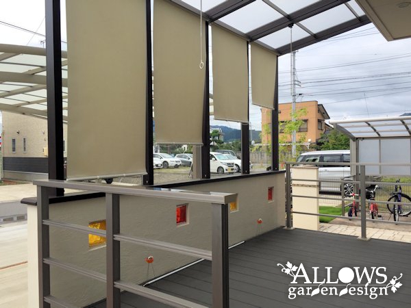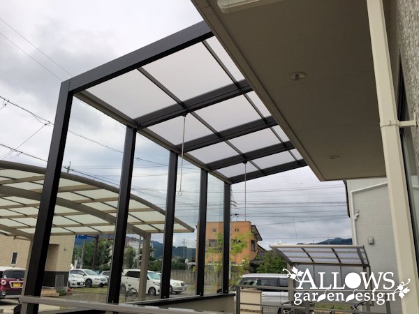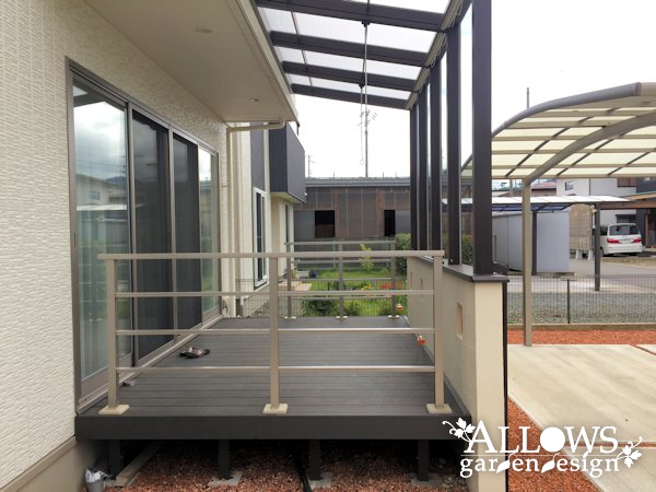 そこでウッドデッキはそのまま活かして、屋根と前面のガラス、そして腰壁が付いた『ココマⅡ サイドスルー腰壁タイプ』を設置。