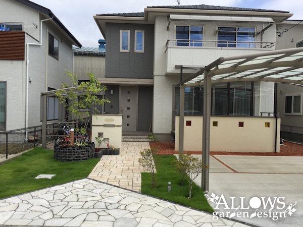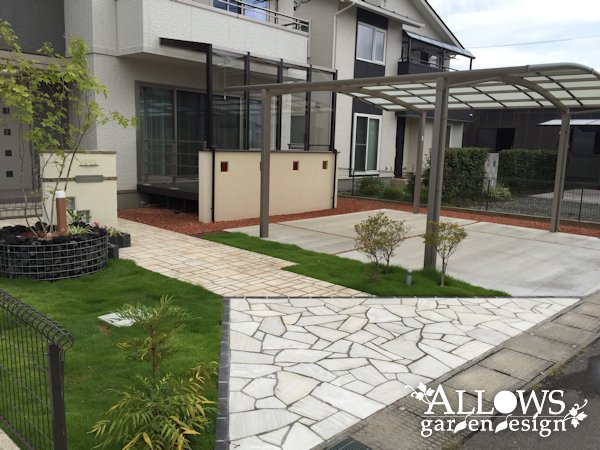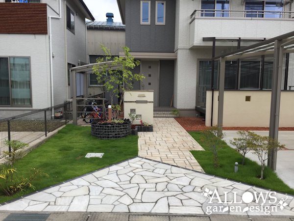 アプローチは基本的に残し、道路沿いの一部をカットして高級素材の天然石張りに。