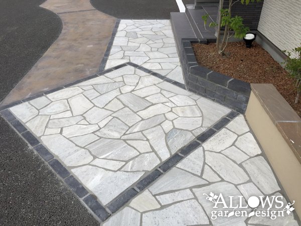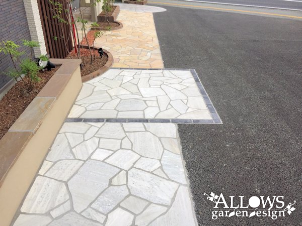 二棟を繋ぐアプローチは、天然石の乱張り。