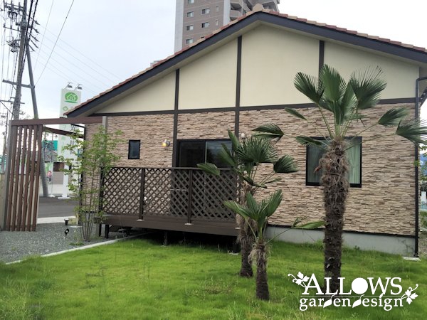 道路面には、芝のガーデンと三本のトウジュロ。