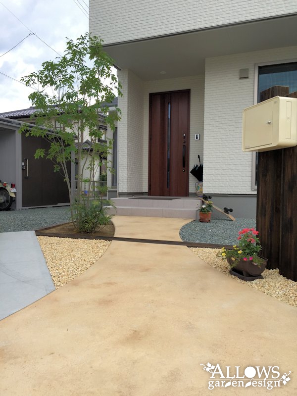 アプローチは色むらを付けて自然風に仕上げたコンクリート舗装。