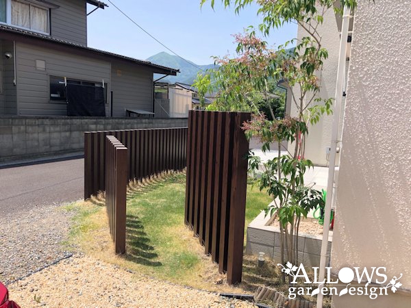 目隠しのスリットフェンスも、家やカーポートのカラーと合わた木目調で統一感が出ています。
