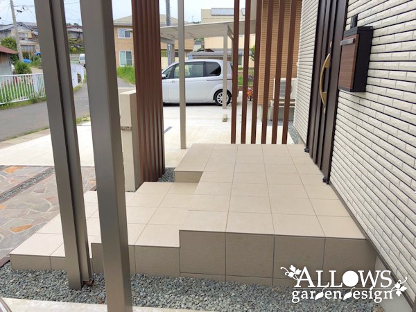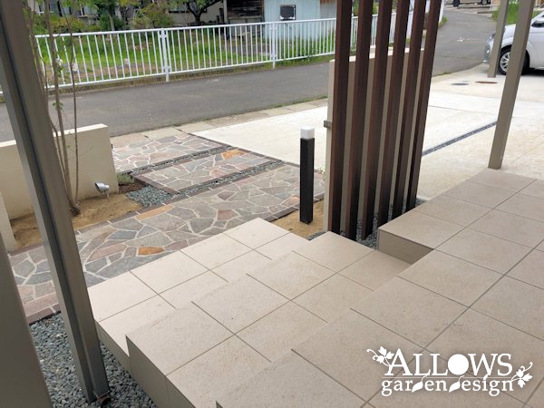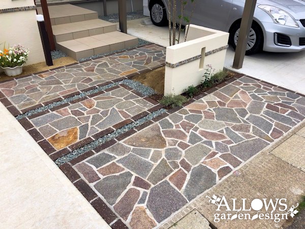 アプローチは、レンガで縁取ったイタリア製の天然石乱貼りです。