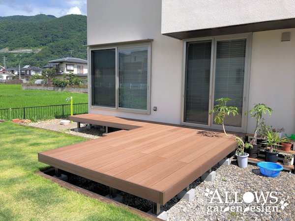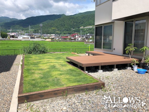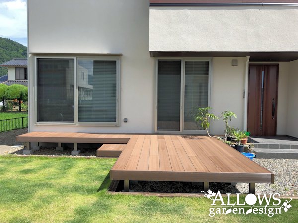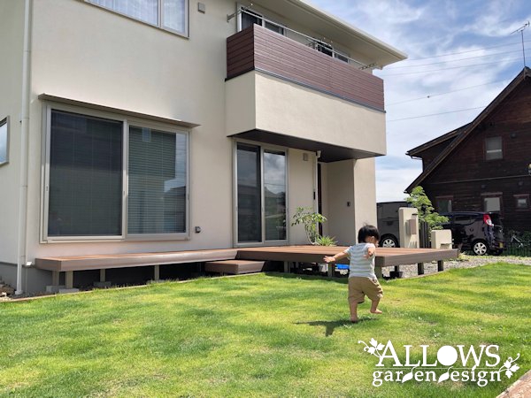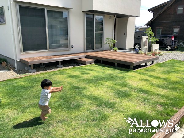 L字型にしたことで、ウッドデッキの上でくつろげるスペースも確保でき、芝の部分も広く取ることができました。