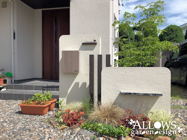 高さに変化を付けたウォールの間に、木目調のスリットフェンスを立てたデザイン。
